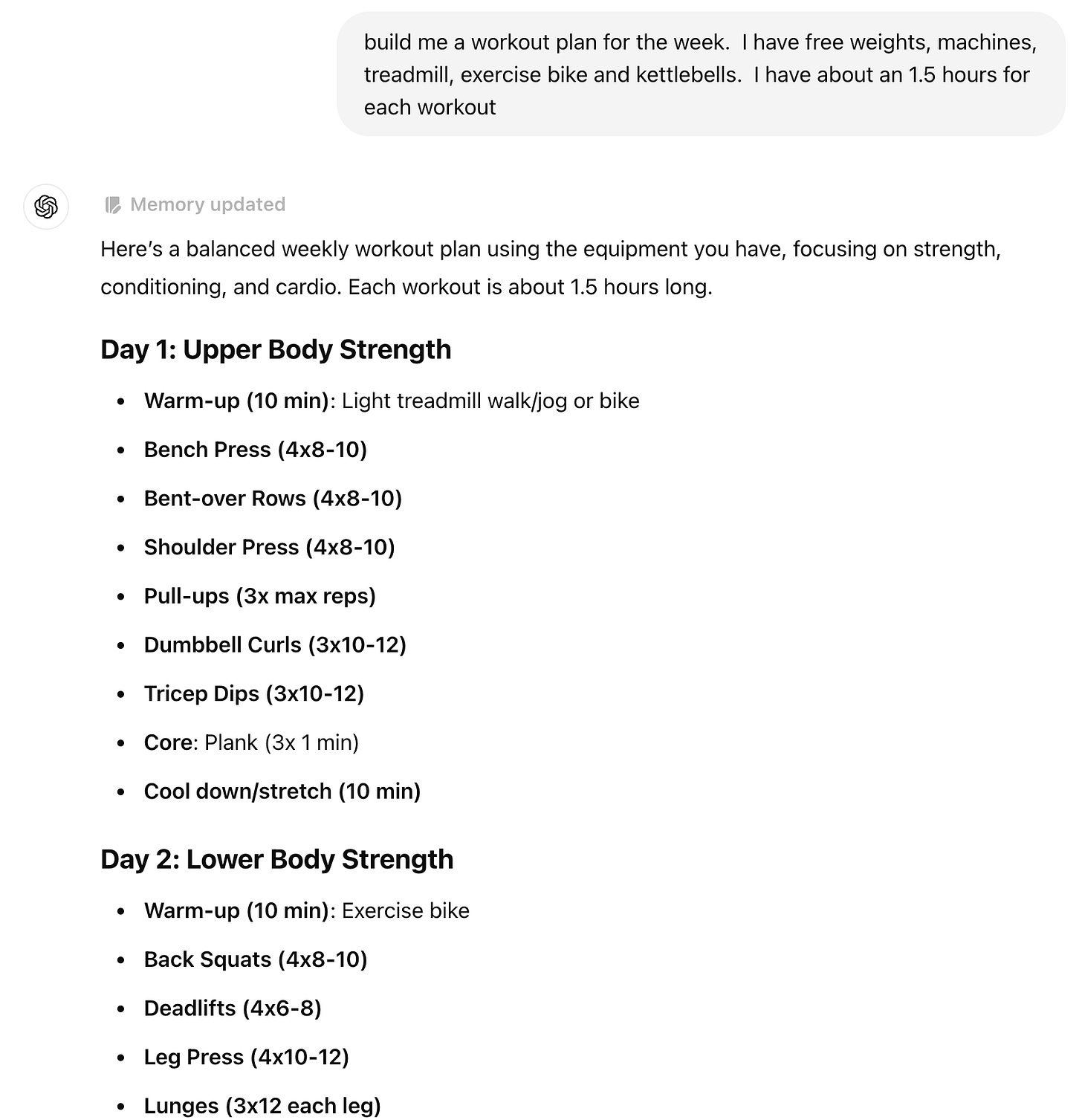 4 - Build workout plans/workouts. Need to quickly plan a workout or workout plan for the week - ChatGTP can easily do that:
