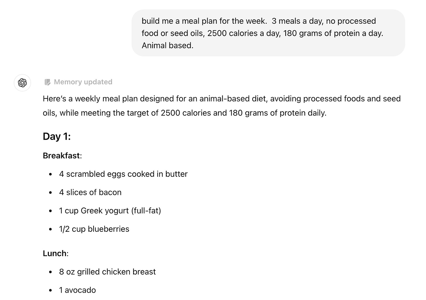 3 - Build a meal plan for the week. Eating healthy can be a challenge but AI can be a huge help. Try this in ChatGTP: